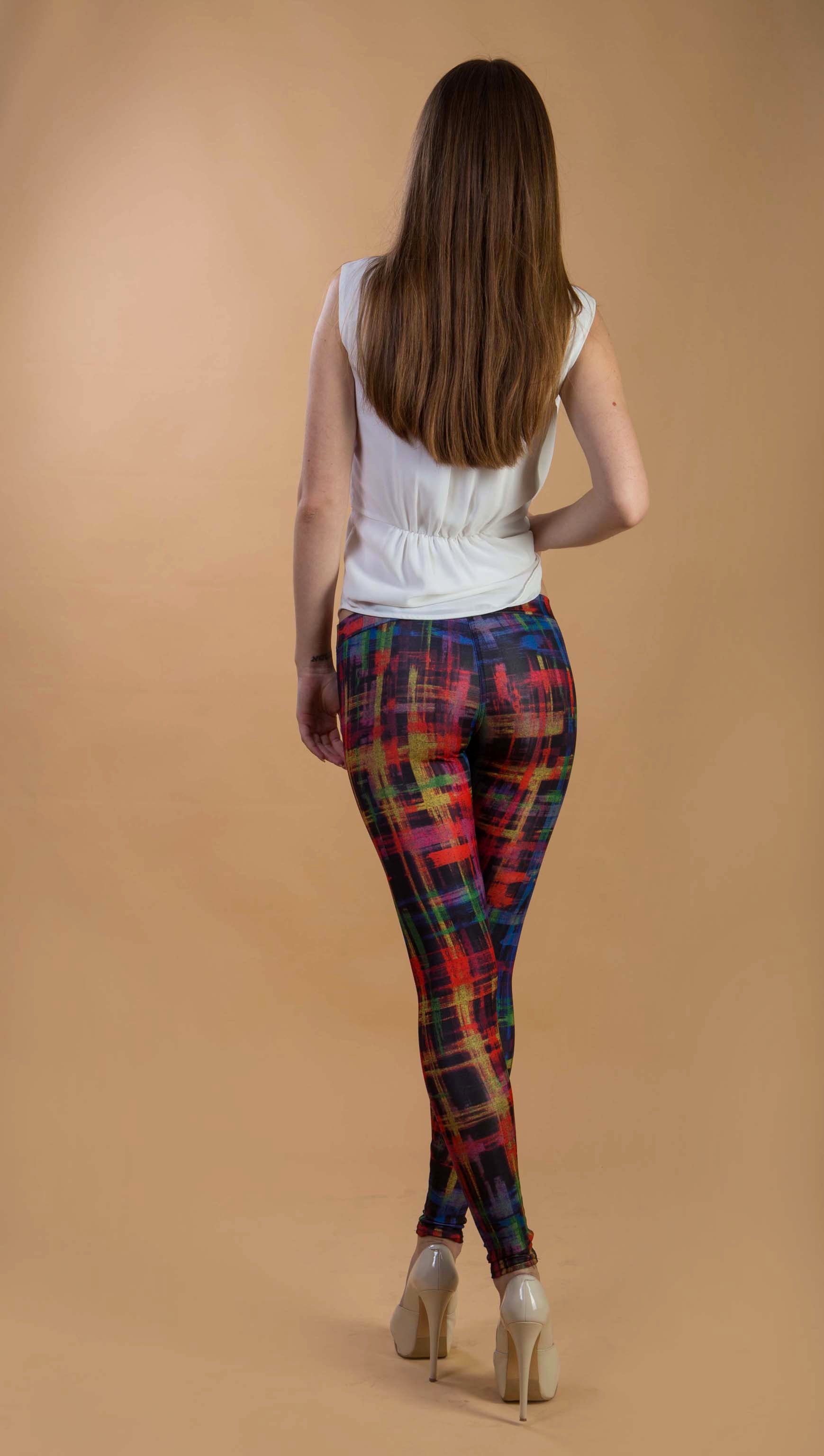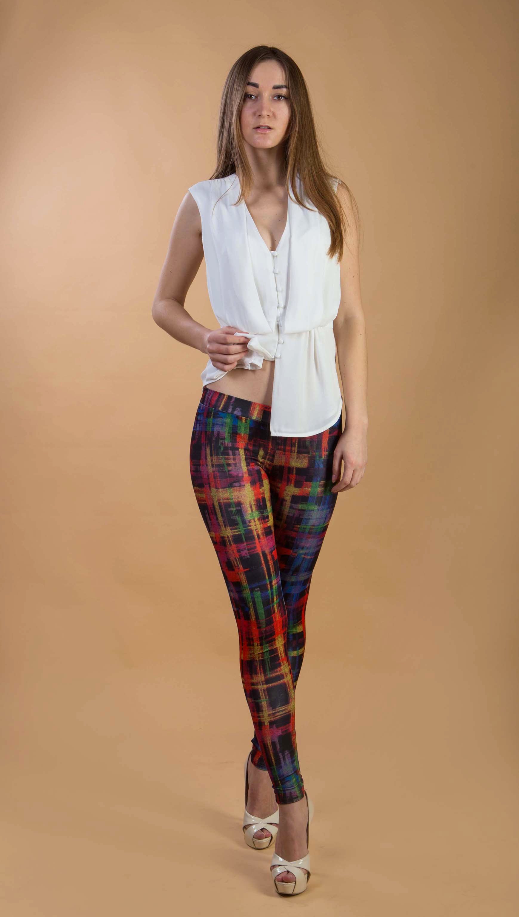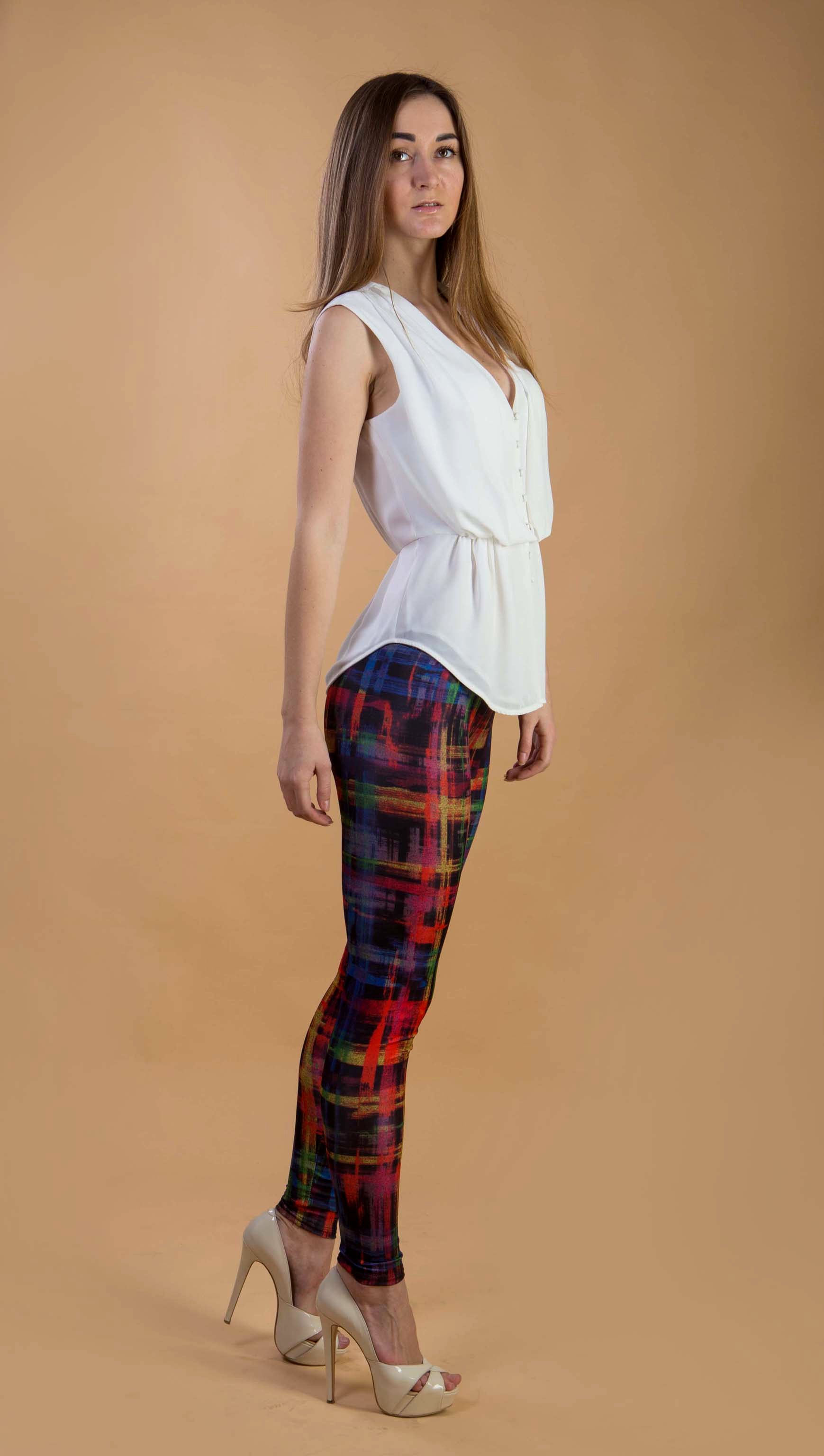 Соблазнительные и оригинальные цветные лосины для уверенных в себе девушек. Подчеркнут фигуру и раскроют Вашу оригинальность. Дополните образ оригинальной футболкой и босоножками на высоком каблуке.